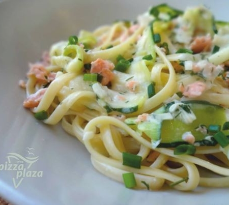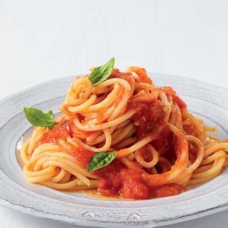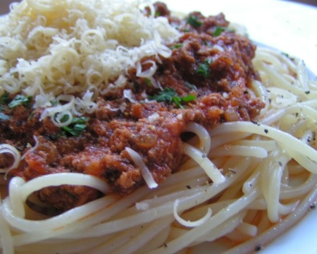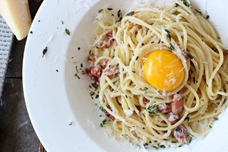 makaron spaghetti w śmietanowym sosie z żółtkiem, bekonem i szynką