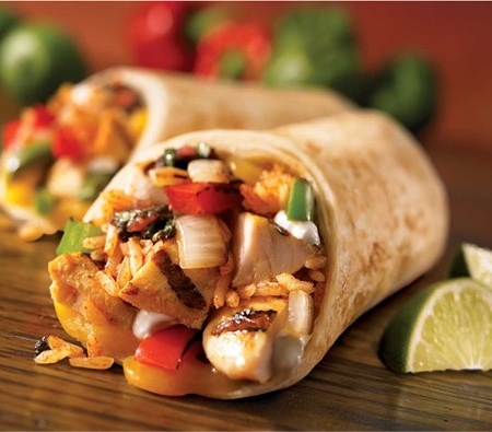 tortilla, mielona wołowina, cheddar, grillowana papryka, cukinia i cebula, sos czosnkowy